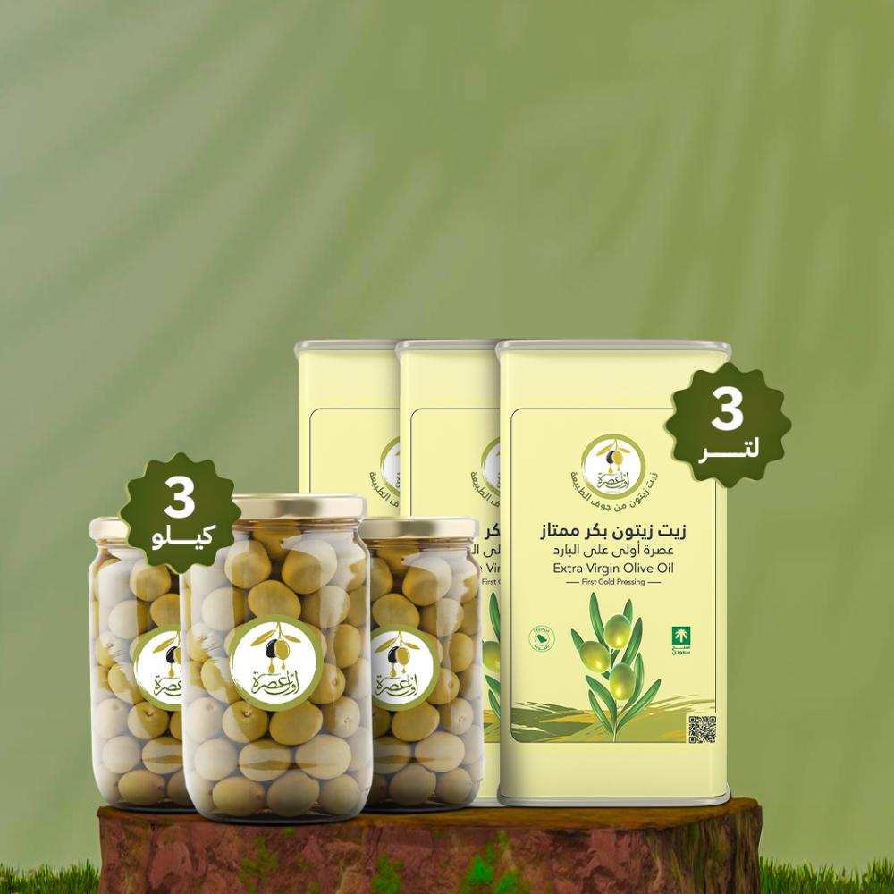 • 3 عبوات (1 لتر) من زيت الزيتون البكر الممتاز عصرة أولى على البارد.